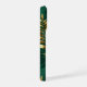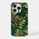 Seamless pattern of gold, jewelry, shiny fern branches and leaves on green, woodland, textured background. Golden fern.