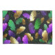 Seamless pattern of bright purple, green, and gold feathers on black Mardi Gras background. Design for the Mardi Gras holiday.