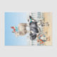 Vaca, ovelha, frango, e pato na praia, na areia, com cerca de piquete branca e fundo oceânico e céu. 15 x 20 18 lb