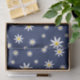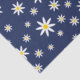 Um padrão de flores margaridas brancas com anéis amarelos em azul marinho.