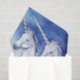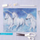 Papel de tecido dotado com uma imagem de três unicórnios contra um fundo azul.