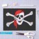 Papel tecidular com imagem de uma bandeira pirata em cores de vermelho, preto e branco.