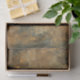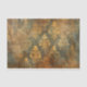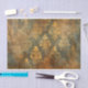 Este é um padrão decorativo ornamentado em tons de ouro, turquesa e ferrugem. O design apresenta um damasco intrincado, simétrico ou arabesco que se assemelha a folhas estilizadas de acanthus, pergaminhos e elementos florais dispostos em colunas verticais. Os padrões têm uma aparência afligida, meteorológica, com áreas desbotadas e vestidas, revelando turquesa e ferrugem por baixo da camada superior de ouro. Este efeito patina envelhecido dá ao design uma sensação antiga ou vintage.