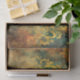 Este é um padrão decorativo ornamentado em tons de ouro, turquesa e ferrugem. O design apresenta um damasco intrincado, simétrico ou arabesco que se assemelha a folhas estilizadas de acanthus, pergaminhos e elementos florais dispostos em colunas verticais. Os padrões têm uma aparência afligida, meteorológica, com áreas desbotadas e vestidas, revelando turquesa e ferrugem por baixo da camada superior de ouro. Este efeito patina envelhecido dá ao design uma sensação antiga ou vintage.