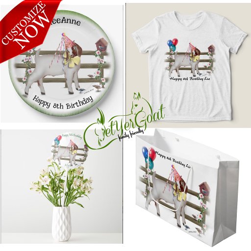 Personalize este adorável Livro de Tecidos da Festa de aniversário Boer Goat ou remova o texto - um garoto boer bonitinho vestindo um chapéu de aniversário e balões de aniversário para toda a festa de aniversário do tema da cabra