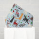 Gato branco, gato preto, gato de mesa, gato persa, gato siamês e gato de smoking, vestidos com roupas festivas de natal, chapéus de Papai Noel e blusas de gárgula com padrão de Enfeites de natal espalhados.