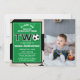 Segundo Aniversário do Futebol! Celebre seu jogador de futebol com este design de aniversário de futebol fofo, criado com um histórico de campo de futebol com "DOIS" que tem um futebol no lugar do "O". Personalize o texto e troque a foto com a foto do seu jogador de balé para um toque especial no dia especial do seu filho com estes convites de festas de aniversários de arte!