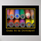 Foto macro de lápis coloridas com um lápis de solteiro ousando apontar para a outra direção e a linha "Atreve-se a ser diferente". Um sentimento excelente para qualquer um, incluindo um adolescente, um quarto de crianças ou um escritório.