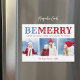 Cartões de foto de Natal magnéticos personalizados com um modelo simples para personalização. Este design festivo bonito apresenta tipografia FELIZ BE em negrito em cores azul e vermelha. A saudação abaixo diz "Feliz feriado da nossa família para a sua". Personalize-o com 3 fotos da família, seus nomes e o ano. Use as ferramentas de design para escolher qualquer cor de fundo, editar as fontes e cores do texto ou adicionar mais fotos para criar uma única de um tipo de Cartões de foto de Natal.