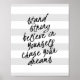 Uma peça inspiradora de moderna decoração de muros que lê, "mantenha-se forte, acredite em si mesmo, persiga os seus sonhos" num texto ousado, escrito à mão, que parece cursivo. Um lembrete diário para ir confiantemente na direção do desejo do seu coração e ser verdadeiro consigo mesmo. Texto contemporâneo ousadamente impresso em texto preto com tipografia caprichosa numa cinza de tendência e fundo listrado branco para decoração perfeitamente neutra.