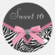Adesivos elegantes de zebra rosa para festa de 16 anos. Este adesivo de zebra rosa e preto é facilmente personalizado para o seu evento, bastando clicar no botão "Personalize!" para começar a adicionar os detalhes do seu evento, estilo de letra, tamanho e cor da letra e texto. Por favor, note que todos os adesivos, cartões e convites que você encontrará no Zazzle são gráficos impressos sem pedras, laços, relevos, ou peças ou partes adicionais.