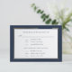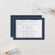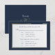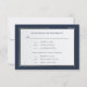 Este convite de resposta com escrita à mão em azul sobre fundo branco e uma borda azul escura e dourada é um cartão de resposta e seleção de menu elegante. O verso tem um fundo azul escuro com seus nomes e um 'e' comercial dourado. Pode ser usado para casamentos, renovação de votos ou aniversários