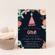 Adoráveis convites para o seu primeiro aniversário selvagem... um boho boral e uma ilustração rosa. "Ela é uma selvagem" aparece em letras de pêssego, com seus detalhes de festa de aniversário embaixo, em um rico fundo azul marinho.