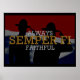 Silhuetted saudando os fuzileiros sobre um campo de vermelho, branco e azul e as palavras "sempre fiel" e "semper fi". Semper fi é o lema latino abreviado de Semper Fidelis.