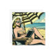 Estilo de banda desenhada de arte pop, preto e amarelo, ai art retratando uma mulher lendo um livro na praia em óculos escuros e vestindo um chapéu de sol debaixo de um guarda-chuva.