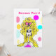 Uns desenhos animados maravilhosos de uma jovem senhora com cabelo enorme em seu aniversário. Humor.