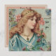 Esta imagem vitoriana excelente apresenta uma jovem com cabelo comprido e uma blusa azul que tem flores rosa e azuis ao seu redor e no cabelo. Use este design para qualquer ocasião. Nota: Se preferir nenhum escrevendo, poderá retirá-lo no recurso de edição.