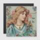 Esta imagem vitoriana excelente apresenta uma jovem com cabelo comprido e uma blusa azul que tem flores rosa e azuis ao seu redor e no cabelo. Use este design para qualquer ocasião.