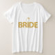 Brilha com brilho em nossas Douradas sequências de noiva, mais T-Shirt! Projetada para conforto e brilho, esta na moda apresenta uma sequência falso brilhante que é perfeita para diversão pré-casamento. Um ajustado fabuloso para celebrar a noiva em estilo confiante e brilhante!