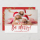 Seja Feliz Cartão com fotos De Manuscrito Com Letra De Natal. A foto e o texto deste script de pincel com letra manual podem ser atualizados e personalizados com sua foto e seu nome de família. Este cartão apresenta também o nome da família e uma coroa de folha de ouro no verso do cartão de Natal.