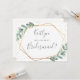 Essa carta super fofa é a maneira perfeita de perguntar "você será minha dama de honra?" A design apresenta uma estrutura geométrica de folha de ouro cúbica com texto tipográfico de tendência e cor d'água exuberante eucalipto verde. Estas cartas são fáceis de personalizar e podem ser usadas para pedir aos seus entes queridos que sejam a sua dama de honra, empregada ou dama de honra, florista, etc.