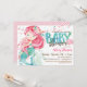 Um convite para chá de fraldas de sereia. Apresenta uma sereia com cor rosa e azul-aqua, cor verde com aspecto aquarela.