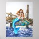 Com suas lindas fechaduras vermelhas e cauda de turquesa, uma sereia solta-se em uma doca de madeira perto do mar. Primeiro, ela escolheu um cobertor bonito para se sentar, depois espera que alguém passe e aproveite a brisa com ela. Pôster.