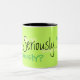 Seriamente copo de café - fundo do verde limão com texto preto, verde e amarelo - quantas maneiras podem você dizer seriamente
