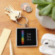 Um design gráfico dos sete chakras em um chaveiro premium. O chaveiro tem um modelo de texto para a sua personalização, e a cor de fundo pode ser alterada.