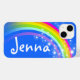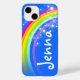 capas de iphone bonito do arco-íris em cores azuis e coloridas. Personalize com sua própria escolha de nome até 5 letras. Este exemplo diz Jenna. (***Anote que alguns nomes nem sempre serão ajustados devido à natureza da fonte. Desenvolvido e ilustrado exclusivamente por Sarah Trett para www.mylittleeden.com
