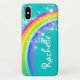 Ajude a proteger o iphone da sua criança contra batidas e acidentes de criança, com este bonito design arco-íris para capas de iphone de meninas. Personalize com seu nome infantil. Este exemplo diz Rachelle. Desenvolvido e ilustrado exclusivamente por Sarah Trett. www.sarahtrett.com