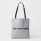 Bolsa tote cinza que você pode personalizar digitando seu nome. Você também pode alterar o estilo da fonte, a cor da fonte e a cor da bolsa tote na ferramenta de design. Por favor, verifique a aparência após digitar seu nome. Se a aparência for de seu agrado, você pode fazer seu pedido agora. Se precisar redimensionar ou reposicionar seu nome, ajuste na ferramenta de design.