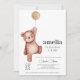 Um convite a chás de fraldas neutro em termos de gênero, que inclui um ursinho de pelúcia e um balão bege. Itens correspondentes disponíveis na coleção Teddy Bear Theme.