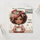 Uma querida menina vintage segurando um bolo e celebrando seu aniversário. A saudação no cartão é "Shana Happy Birthday". Na parte de trás da carta está uma pequena versão da mesma criança, com bastante espaço para escrever uma mensagem. Feito com o auxílio do AI Bing (CoPilot).