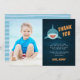 Belo plano, obrigado cartas pelo seu pequeno entusiasta do tubarão, um tubarão sorridente em um fundo azul-oceano ondulado, com "obrigado" e sua mensagem pessoal e assinatura. Personalize com uma foto favorita do aniversariante para um toque pessoal "maxilar".