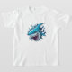Shark's Mouth: The most striking feature is the open mouth filled with rows of sharp teeth. The teeth are depicted in white against the darker purple interior of the mouth, creating a stark contrast that emphasizes the aggressive nature often associated with sharks.