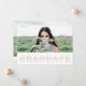 O anúncio de fotos de graduação moderna apresenta sua foto horizontal favorita orientada ou horizontal na frente, com "formando" exibido abaixo em elegante letra rosa-pincel. Personalize com seu nome, ano de escola e graduação em uma camada branca. Cartões revertem para uma foto adicional com uma faixa ao longo da base para personalizar com os planos de formando para a faculdade ou carreira. Uma escolha elegante e moderna para a classe dos formandos de 2022.