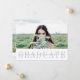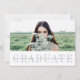 O anúncio de fotos da graduação moderna apresenta sua foto horizontal favorita orientada ou horizontal na frente, com "formando" exibido abaixo da elegante letra azul-cinza. Personalize com seu nome, ano de escola e graduação em uma camada branca. Cartões revertem para uma foto adicional com uma faixa ao longo da base para personalizar com os planos de formando para a faculdade ou carreira. Uma escolha elegante e moderna para os formandos de 2017.