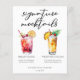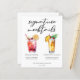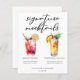 Esta folha de menus de assinatura química apresenta uma simples tiopgrafia negra acima de 2 bebidas bonitinhas e seus ingredientes para o seu bar de casamento. Um Shirley Temple e Piña Colada virgem não alcoólica adicionam um talento legal ao seu menu de bar. Preencha com os nomes dos casais e a data para sua recepção.