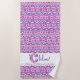 Toalha de praia com monograma personalizado de letra inicial C e significado do nome. Lindo monograma de letra inicial C desenhada à mão, nome e significado da toalha para meninas em roxo, rosa e branco. Ideal para um presente personalizado para uma menina cujo nome começa com a letra C. Este exemplo lê Chloe Blooming. Uma deusa verdadeira e simples ou você pode personalizar o texto com seu próprio nome e mensagem ou palavras. Faz um presente único para meninas, aniversário, feriados ou celebração. © Letra tipográfica C com flores e corações desenhados à mão e padrão criado exclusivamente por Sarah Trett. www.sarahtrett.com para www.mylittleeden.com