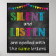 POSTER imprimível SILENT & LISTEN Um poster de excelente para pendurar numa sala de aula de todas as idades para lembrar às crianças que não é a consciência de que o silêncio e a escuta são soletrados com as mesmas letras! Possui design a desenhar ocular nos olhos do estudante para garantir que LEIAM e LEMBRAM-SE de serem SILENCIOSOS e ESCUTEM! Um poster de excelente para decorar a sala de aula - cores brilhantes e um fundo chalkboard de estilo falso. Impressões lindamente!