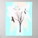 Um design com uma silhueta de pássaros voando ao redor de uma árvore em um fundo de abstrato. As cores são preto, bronzeado, creme e aqua. Sinta-se à vontade para alterar o tamanho deste impressão de poster ou adicionar texto às suas necessidades!