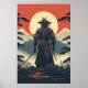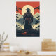 Silhuette de um guerreiro Samurai com a lua, montanhas e árvores.