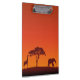 Fundo africano da paisagem do safari que caracteriza silhuetas de um girafa, de uma árvore e de um elefante contra o por do sol em máscaras da cor alaranjada e vermelha.