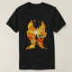 Uma design de camiseta impressionante com uma silhueta de uma pessoa em pé contra um pano de fundo de padrões abstratos que se assemelham a chamas. O brilho do Sol no centro simboliza a esperança, enquanto os vibrantes tons laranja e amarelo evocam energia e criatividade, colocados contra um fundo negro e ousado para contraste dramático.