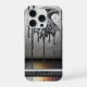 A detailed silver metal eagle emblem set against a textured industrial background with dripping paint effects. The embossed, chrome-like relief evokes strength, heritage and modern decorative craftsmanship in monochrome.