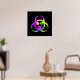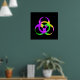 Poster preto com símbolo vívido verde e roxo de risco biológico.