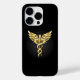 Símbolos caduceus poligonais dourados em fundo preto isolado. Símbolo de medicina low poly.