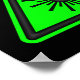 Poster preto com um símbolo de aviso de laser verde.