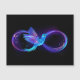 Símbolo luminoso, roxo e infinito com beija-flor azul voadora, luminosa, em fundo preto. Neon.
